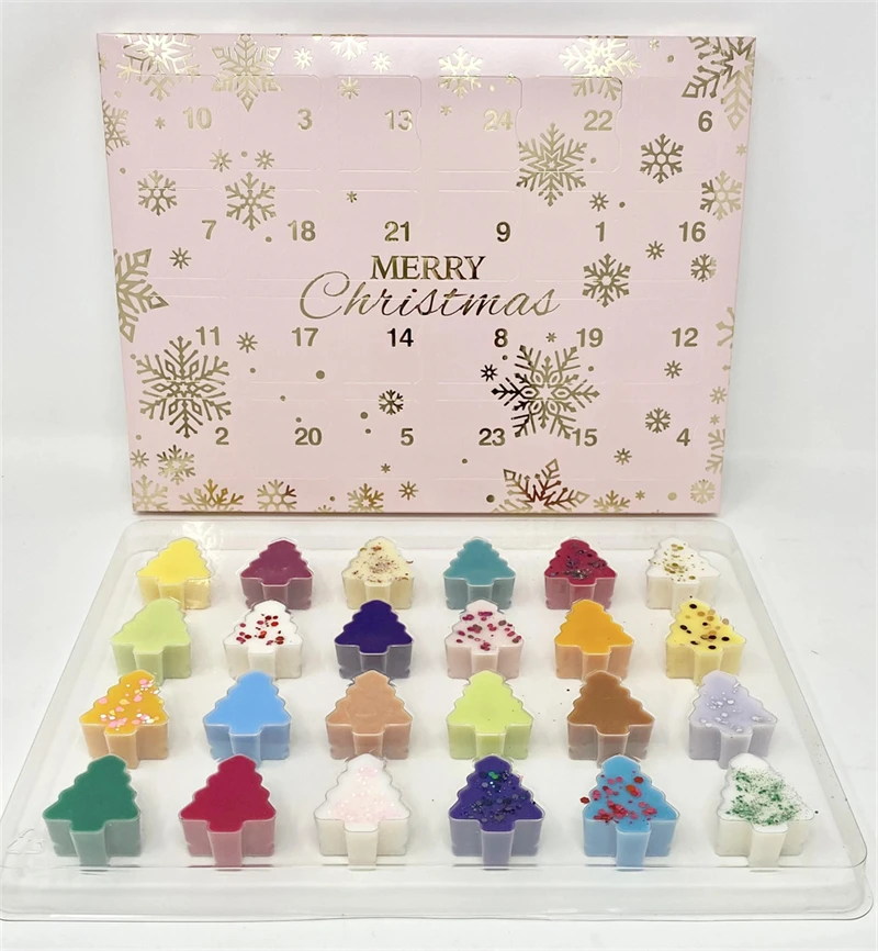 Custom 24 Days Merry Wax Melt Advent Calendar Box Christmas Tree Plastic Tray for Face Eye Cream Embossed Matt Laminated